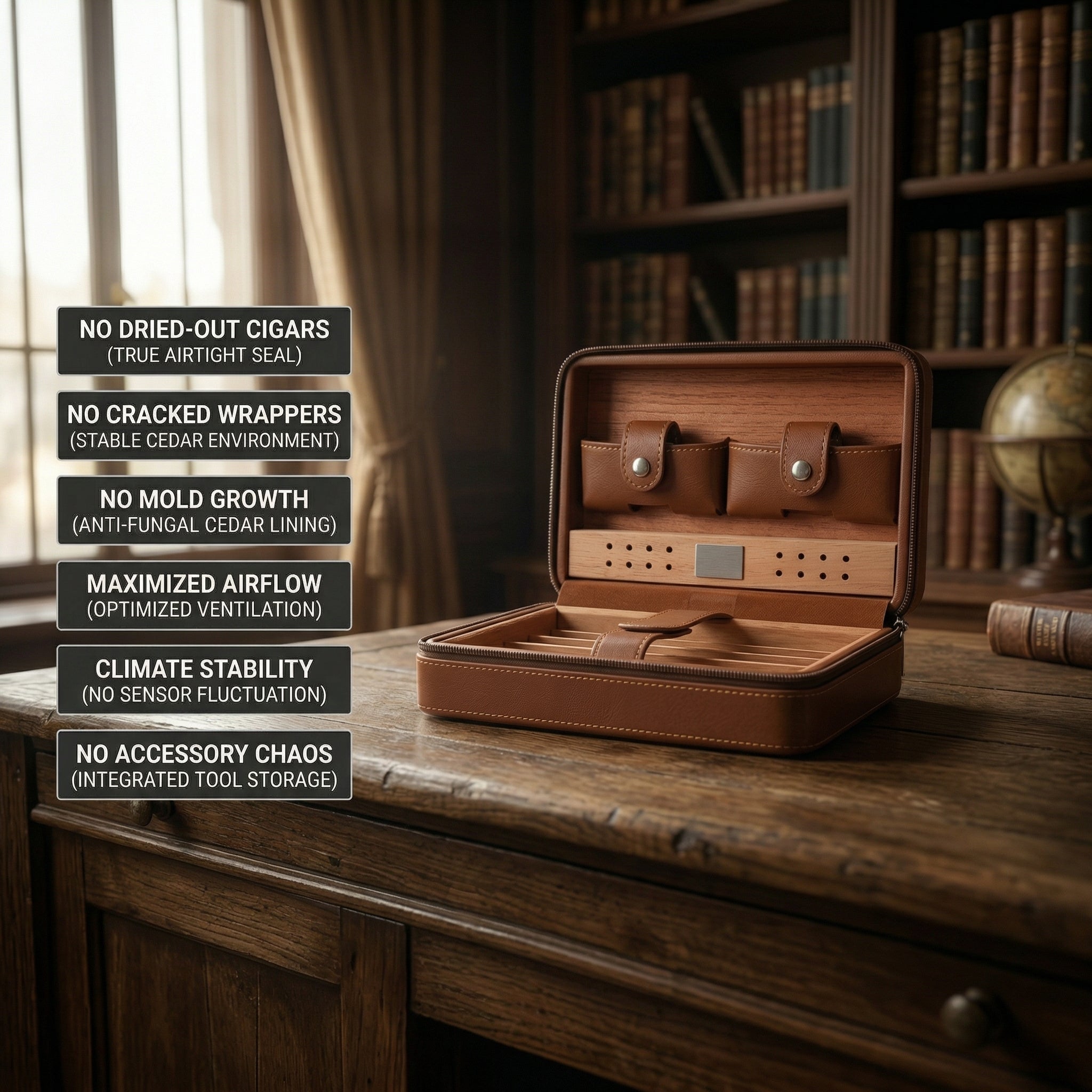 Cedar lining keeps humidity stable in transit. Airtight seal means no dry cigars on arrival. Built-in humidifier runs the whole trip. Nothing to check. Nothing to fix when you land.